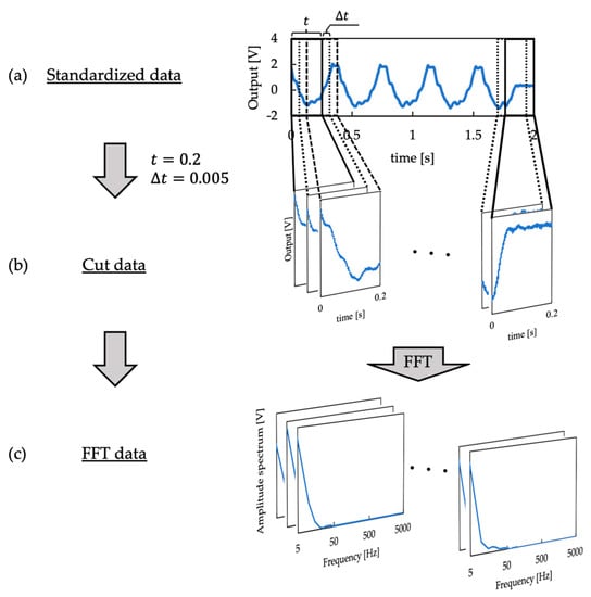 where is the average and is the standard deviation of all data points (corresponding to (a) in Figure 5). Next, from vibration information having a total time length of 2 s, the information for a period of 0.2 s was slid by 0.005 s, and 361 pieces of vibration information for a period of 0.2 s were extracted per measurement (corresponding to (a) to (b) in Figure 5). In other words, 25,270 pieces of vibration information for each period of 0.2 s were extracted for each of the four receptors, A1, A2, B1, and B2. A fast Fourier transformation (FFT) was then performed on the vibration information for each period of 0.2 s to obtain 1000-dimensional information in the frequency range of 5 to 5000 Hz in 5 Hz increments (corresponding to (b) to (c) in Figure 5). The FFT was performed using the Python library NumPy [38] with 2000 data points and a Hamming window as the window function.