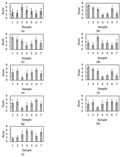 Results of the sensory evaluation of the seven aluminum samples. A semantic differential method with a seven-step unipolar scale was employed for sensory evaluation. (a–i) represent the words, (a) rough, (b) uneven, (c) coarse, (d) prickly, (e) smooth, (f) rugged, (g) slippery, (h) sleek, and (i) dry ().