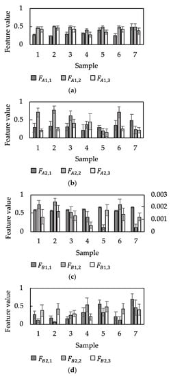 Results of feature extraction. Graphs show the feature values for (a) A1, (b) A2, (c) B1, and (d) B2 (). The vertical axis on the right in (c) gives the value of .