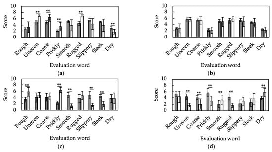 The results of the sensory evaluation are shown in Figure 6. Each graph presents the mean score and standard deviation for each evaluation term used. The figure shows that there are obvious differences in the tactile sensation among the samples.