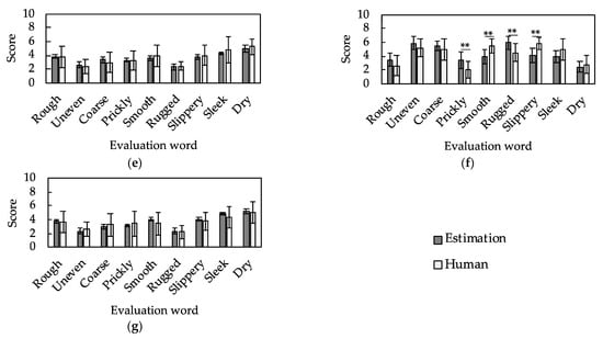 Comparison of the mean and standard deviation of the tactile scores estimated by the estimation model (gray, ) and the evaluation values obtained in the sensory evaluations by human participants (white, ) for the nine evaluation words in each sample. Each panel is the result for a model that estimates the tactile sensation of (a) sample 1, (b) sample 2, (c) sample 3, (d) sample 4, (e) sample 5, (f) sample 6, and (g) sample 7 (**).