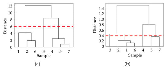 As described in Section 3.3, there are two groups of samples. That is, the tactile sensations of samples 2, 5, 6, and 7 can be properly estimated by the developed system, whereas those of samples 1, 3, and 4 cannot. We discuss here two aspects of the differences between the two groups, namely the different characteristics of each sample and the learning status of the neural network, to clarify what type of sample is suited to our tactile estimation system. To understand the difference in samples, we performed cluster analyses based on the evaluation scores from sensory evaluation and on features extracted from vibration data obtained with the tactile sensor. In the cluster analysis, we employed the Ward method, which is an agglomerative hierarchical method [43,44]. The calculation was conducted with Scipy, a Python library [45].