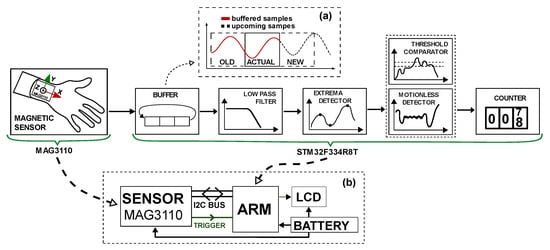 However, the research trends in the improvement and development of magnetic field sensors have increased their resolution and minimal detection threshold []. Thus, they could be a good replacement for current solutions in certain areas of activity detection. Therefore, we present an approach for step detection and counting based on real-time processing and analysis of magnetic field variation measured by magnetic field sensor. This approach was implemented using a well-known and widely used embedded platform and a commercial digital magnetic field sensor. By combining a magnetic field sensor with the proposed complex multiblock signal processing algorithm, high step detection accuracy (98%) was achieved. The obtained results show that a single magnetic field sensor can be used to detect steps, and in general, this offers the possibility of simplifying the current solutions. Moreover, the block design of the proposed approach allows the different processing parts to be easily replaced, which can significantly reduce the processing time or the power consumption of the whole system in certain applications without compromising the accuracy of step detection, which is a key factor in systems with stringent and limited power and energy requirements.