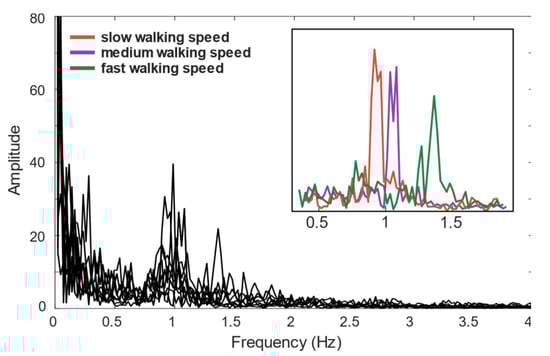 FFT analysis showed that the cutoff frequency of the filter set to 2 Hz removes higher frequency components without losing step detection information. The spectrum of recordings from several walking sample records (Figure 3) shows that walking at different speeds significantly affects the frequency components below 2 Hz (Figure 3-inset). The walking speed in relation to frequency can be calculated by the following equation: