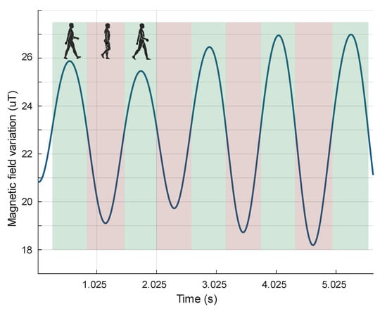 The direct extrema mapping approach allows all detected extrema to be linked to steps during the walking period. This is the simplest method for detecting steps. The direct mapping approach is used when the amplitude difference between two consecutive extrema exceeds 0.5 uT (10 sampling units). The noise of the sensor does not exceed 0.25 uT []. The level of fake step (0.5 uT) was determined as the average value of the amplitude difference between two adjacent extrema in multiple test recordings where no ambient (generated by the desired motion) disturbance was detected.