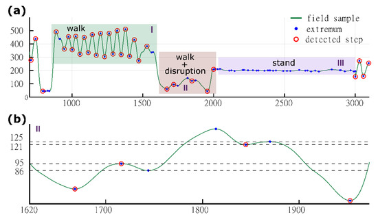 Extrema in magnetic field variations caused by walking can be related to the steps taken. Long term (approx. 1 min) recording of filtered magnetic field samples (Figure 5a) shows a deviation in relative extrema levels during mixed walking and standing action. Analysis of these changes led to the need to distinguish three different approaches to step detection based on extrema. The first is direct extrema mapping, where the detected extrema represent steps. The second, which is more complex, is where additional environmental disturbances must be filtered out before assigning the extrema to steps. In the third method, motionless phases (while standing) are skipped, and the extrema cannot be correlated with steps.