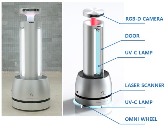 Robots have long served industrial applications, ranging from car manufacturing to package sorting. Robotic applications are gradually moving closer to the end user. The severity of the pandemic has proved that healthcare workers require all possible help, whether from humans or robots. Research related to robotics around the world is stepping up with regard to the development of robots that can help prevent the spread of COVID-19 [6,7]. There are various types of robots, such as drones [8,9], humanoids, legged robots [10], and mobile-based robots [11], all of which have different characteristics. Drones patrol areas and enforce lockdowns, assisting police officers [12]. Humanoid robots assist hospital staff by delivering medicine to patients, for instance, in the form of legged robots to take care of patients remotely. Mobile robots are used to disinfect public areas, such as airports and hospitals [13]. In such places, mobile robots do not have to move on all-terrain, as with legged robots, and they have great stability and movement efficiency. In particular, autonomous mobile robots are capable of autonomous navigation without external guidance. Mobile robots equipped with autonomous driving functions are commonly utilized to perform disinfection tasks. For example, hospitals, offices, and public spaces must halt the spread of the virus and maintain a clean and healthy environment. For such purposes, UVD robots can be utilized to help maintain a clean environment [14,15,16].