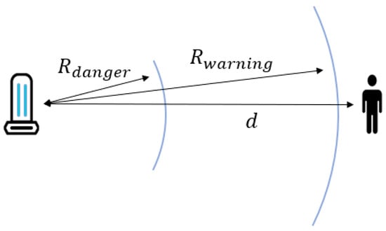 Figure 2. The dangerous radius of R d a n g e r and the warning radius of R w a r n i n g of the UVD robot are set. The UVD robot detects a human and measures the distance of d.