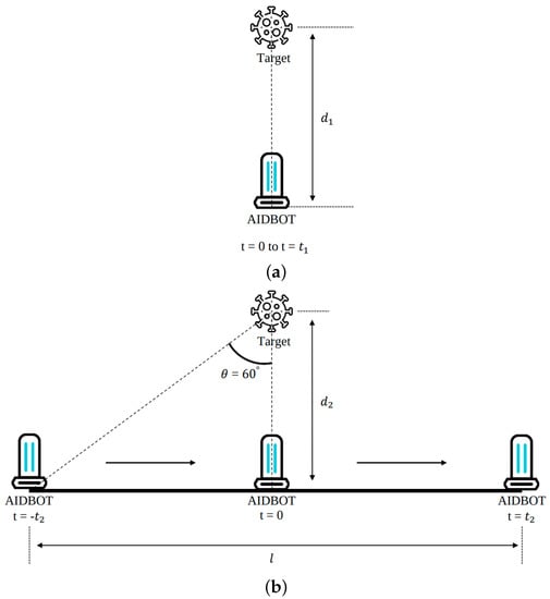 Figure 3. Illustration of two disinfection experiments with the UVD robot (a) Without moving, the UVD robot disinfects a target d 1 meters away for t 1 seconds. (b) At a velocity of v 2 , the UVD robot disinfects a target d 2 meters away for t 2 seconds ( d 2 : vertical distance between the target and the UVD robot’s path).