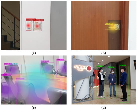 Our goal was the recognition of four objects that required intensive disinfection and one object that should not be disinfected. We trained the YOLOv4 model to detect these objects. To visualize the results, we decided to draw a bounding box for each object predicted by the deep learning model and to display a confidence score. Confidence scores indicate how confidently an object is predicted when a deep learning model makes a prediction. Usually, confidence scores are between 0 and 1, and the higher the score, the greater the confidence of the prediction by the deep learning model. We set the threshold of the confidence score to 0.25 in our object detection model. When the confidence score predicted by the object detection model exceeds the threshold, we display a bounding box and the confidence score for each object. As shown in Figure 4, our model detected disinfection targets and displayed a bounding box and confidence score. The model recognized two buttons with confidence scores of 0.76 and 0.40 and properly displayed the bounding box and confidence score, respectively (Figure 4a). We compared it with EfficientDet-D3 [25], which is known for showing good accuracy and enough speed to work in real-time. As a result, we confirmed that YOLOv4’s mAP was slightly higher than EfficientDet-D3 when trained with our own dataset. Moreover, we tested our YOLOv4 model with 150 images and confirmed that the accuracy of button, handle, desk, chair, and person was 90%, 93.3%, 90%, 93.3%, and 100%, respectively.