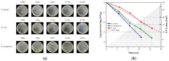For the first experiment, the plates were radiated with UV-C for 4, 8, 12, and 16 s in order to quantify the sterilization effect based on the irradiation duration. All samples were processed in triplicate and were positioned 1 m away from the UV-C source. After the UV-C light irradiation step was completed, the plates were incubated in 37 °C incubators overnight. The surviving bacterial colonies on the plates were enumerated and compared with un-irradiated cases to determine the microbicidal effect.