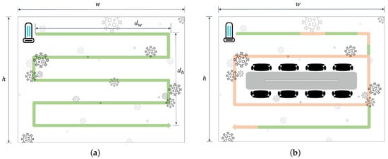 Figure 8. Illustration of a virtual conference room with a width and height of w and h, respectively. In the case of (a), an empty conference room and (b) a general conference room, the expected paths of the UVD robot are correspondingly indicated by the green and pink lines. The green lines denote the path moving at a speed of 0.13 m/s, and the pink lines are the path requiring intensive sterilization.
