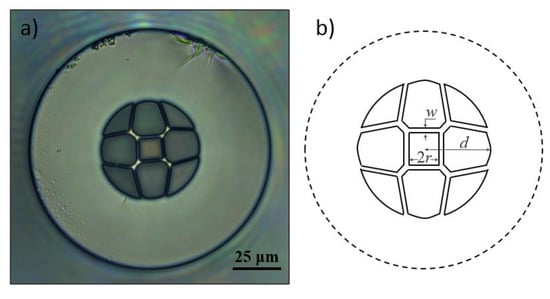 Figure 1a presents a microscopic picture of the HSCF implemented in this work, and Figure 1b shows a scheme of the cross-section model of the fiber structure. The fiber was developed at the Leibniz Institute of Photonic Technology, in Germany. It is characterized by having a hollow core of size (2r) in a squared shape. Surrounding the core, there are silica strands of of thickness (w) conjugated with four capillaries diametrically opposed. Furthermore, the HSCF presents four identical air petal shape structures, intercalated with four interstices. The internal radius of the fiber, where all the air structures are located, is of (d), and the external radius is . All components of the HSCF were fabricated from synthetic high-purity silica tubes (F300, Heraeus Quarzglas GmbH & Co. KG, Hanau, Germany). The fiber was coated with a single UV acrylate layer during the fabrication. The manufacturing process as well as the formation of the specific fiber microstructure are described elsewhere [40].