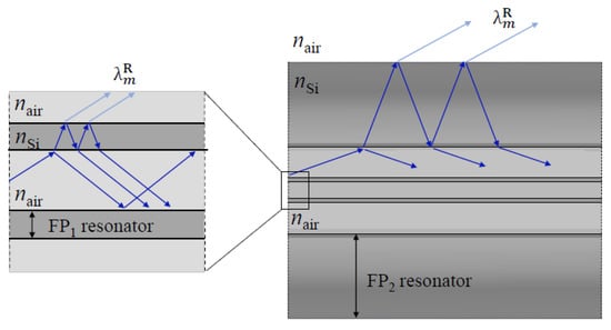 where and are the refractive indices of the waveguide material (silica) and air, respectively, m is the resonance order, and is the incident angle. For the AR guidance, the reflections present glancing angles; therefore, can be approximated to the unit, leading to a simplification in the expression. In the HSCF, there are two distinctive AR guidance mechanisms, namely an internal AR, where light is trapped in the core and surroundings of it, and the external AR, wherein light remains confined in the outer cladding region. Figure 2 illustrates the light propagation in the fiber that originates these two ARs. The light that propagates in the air core, when encountering the interface between the core and the silica strands, will be both reflected, thus remaining in the air core, and refracted to the silica strands. The silica strands will be acting as an FP resonator, which means that for the AR wavelengths, light will be reflected within the resonator and refracted back to the core. As for the resonance wavelengths (internal resonance, IR), light will escape the resonator and will leak to the air structures, being further lost as it propagates [40]. The second AR guidance occurs when light leaks from the core, and thus, it propagates in the petal and interstitial air structures that surround the core. There, light will also be refracted to the outer silica cladding section, which, in turn, will also act as an FP resonator, meaning that the resonance wavelengths (external resonance, ER) will leak out of the fiber.