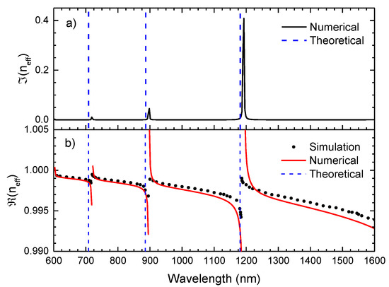 (a) Imaginary effective refractive index with wavelength obtained from Equation (9) (Numerical). (b) Real component of the effective refractive index with a wavelength attained by the COMSOL Multiphysics (Simulation) and by Equation (9) (Numerical). The expected frequency of the IR is represented by dash lines, according to Equation (1).