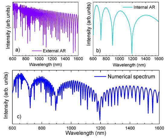 where was retrieved from the imaginary component of Equation (9); thus, one can estimate the transmission windows that are formed by both the external and internal AR propagations, and consequently, the expected transmission spectrum of the HSCF, considering the total modal losses inherent to the HSCF length (l). Notice that to attain the expected transmission profile, a normalization was carried out to the numerical results to better perform a comparison with the experimental results that will be described further ahead. In Figure 4a,b, the transmission curves attained for each AR mechanism are represented, as well as the combined signal (Figure 4c).