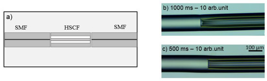 The layout of the sensor used in this work was based on a transmission configuration, where the HSCF was spliced between two segments of SMF, as can be seen in Figure 5a. The splicing process was executed using a Fujikura 40S splicer, which was operated in manual mode, that is, the alignment between fibers was personalized by the user. Given the geometry of the HSCF and the fragility of its microstructures, it was necessary to adjust the parameters of the splicing program so that one could attain an equilibrium between the splicing strength and the integrity of the HSCF structure. To keep the cohesion of the microstructures intact, the arc was applied mainly on the SMF. In addition, to avoid compromising the splicing resistance, it was necessary to adjust the arc discharge power and duration. Figure 5b,c show the influence of the splicing parameters in the HSCF structure. Longer arc discharge times give rise to a collapsing of the external cladding as well as a damage in the internal structure. Therefore, values of 10 arbitrary units (arb. units) and 500 ms were used for the arc power and duration, respectively (for comparison purposes, in an automatic splice, these parameters are set to 20 arb. units and 2000 ms). Several sensors were produced, and their lengths were measured using a caliper.