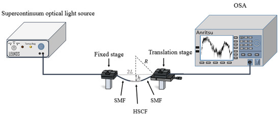 The sensor was placed into a transmission configuration, where a supercontinuum optical light source (LEUKOS SAMBA 450) and an optical spectrum analyzer (Anritsu MS9740A), with a resolution of 0.2 nm, were used, as depicted in Figure 6.