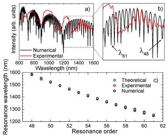 The attained experimental and simulated spectra of a 7.5 mm long sensor are represented in Figure 8a. The similarity between the two is quite notorious. In fact, by observing the zoom in of the transmission spectrum (Figure 8b), between 1200 nm and 1600 nm, a good agreement between the ER peaks is perceptible. It was possible to determine the resonances from the 48th order to the 61st order, by using Equation (1). The differences observed between the high frequency component attained experimentally and the one obtained numerically can be due to different effects, such as losses due the splicing procedures, surface imperfections or mode mismatch, which were not considered in the numerical model. Figure 8c presents the resonance wavelengths retrieved from the experimental spectrum, determined by Equation (1), and by the numerical solution. Although the results are similar, for higher resonance orders, there is a slight deviation. This can be partly justified by the impact of the internal AR guiding that attenuates this phenomenon, therefore leading to a higher difficulty in distinguishing the ER. As for the IR, the HSCF spectrum presents resonance bands and not dips, as one would expect. This could be justified by the slight variations on the thickness of each strand that surround the core, combined with possible fluctuations along the HSCF length, causing a significant deviation on the resonance wavelength, and, therefore, the creation of bands [47]. For instance, considering a variation of 0.1 μm in the strands thickness, according to Equation (1), a shift of 70 nm in the transmission spectrum will be originated. Still, one must notice that the expected resonance wavelengths are within the resonance bands. Furthermore, the amplitude decrease of the AR bands is notorious for higher wavelengths. This can be an indication that the core modes are not so well confined within the core region, and the coupling of light to the cladding region will be favored. Thus, the external AR will be further stimulated, leading to a notorious modulation on the transmission spectrum of the phenomenon at higher wavelengths (1200 nm–1600 nm).