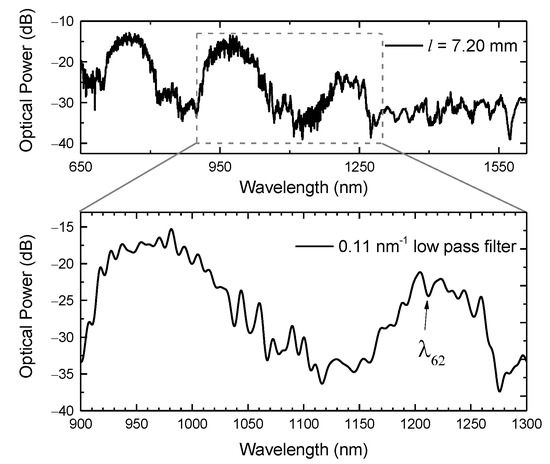 To access an overall perspective of the sensor length influence on the measurements, it was necessary to appraise the spectral response of sensors with distinct sizes. Therefore, two sensors with lengths of 7.50 mm and 9.98 mm were monitored in a broadband ranging from the visible to the infrared windows (600 nm–1600 nm). Figure 7 presents the transmission spectra attained.