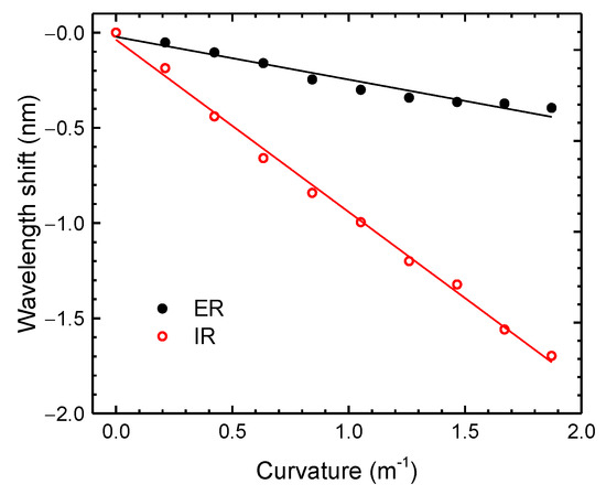 For the curvature measurements, the distance between the fixed stages (2L) was set to 27.5 cm, and the sensor was bent to a maximum height (h) of 20 mm, corresponding to a maximum curvature of approximately 1.87 m−1. The decrease of height was done in steps of 2 mm. In Figure 10, the experimental results attained for the IR and ER are presented. Both components presented a shift towards smaller wavelengths (blue shift). From the results, one can infere that both resonance responses presented a linear tendency, leading to curvature sensitivities of (−0.22 ± 0.02) nm/m−1 (r2 = 0.95064) and (−0.90 ± 0.02) nm/m−1 (r2 = 0.99575), for the ER and IR, respectively. The difference between the correlation coefficients can be attributed to the low pass filter applied in the data processing. Further studies, which are not within the scope of this work, should be performed regarding the best filter to be applied in the context of an application.