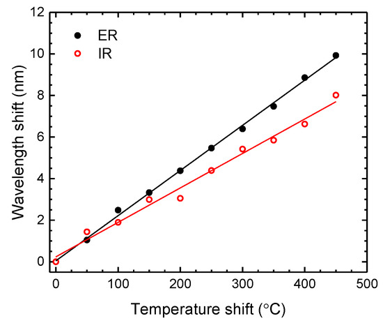 For the temperature measurements, the sensor was heated from 50 °C up to 500 °C, in steps of 50 °C. The obtained results, presented in Figure 11, show a wavelength shift toward longer wavelengths (red shift). Linear responses were attained for both components, presenting temperature sensitivities of (21.7 ± 0.3) pm/°C (r2 = 0.99809) and (16.6 ± 0.7) pm/°C (r2 = 0.98517) for ER and IR, respectively. The magnitude of these values is in agreement with what was established in the literature [50], where it is expected to achieve a higher sensitivity for the thickest resonant structure, that is, for the ER.