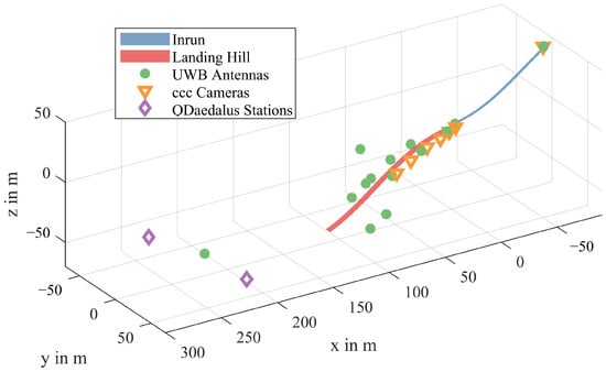 The WRRTS consists of two main components. The first main component of the tracking system comprises antennas with fixed positions along the jumping hill. Figure 1 shows the positions of the antennas along the ski jumping facility as well as the positions of the reference measurement devices.