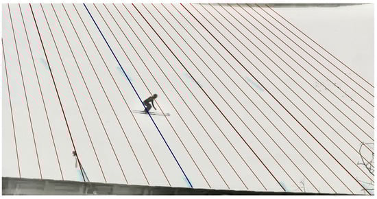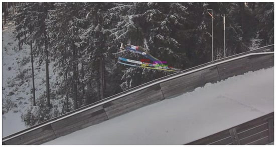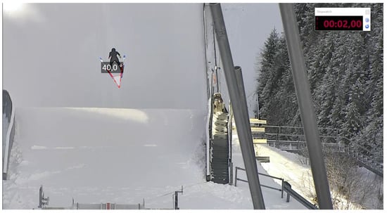 The determination of the V-angle has a worse precision compared to the angle determined from the cameras next to the landing hill. One reason for this is that the V-angle is calculated using the orientation of both skis, which both introduce a measurement error. Apart from this, due to the missing calibration of the PTZ camera, no 3D vectors could be used to measure the V-angles. Instead, they were taken directly from the image. The angles measured by the WRRTS are projected onto the image plane, but effects such as radial distortion through the camera lens are not corrected. This may introduce a bias in the comparison of both methods. Another reason for the bias and worse precision may be the less accurate labeling of the PTZ camera images. This is introduced through the bending of the skis in conjunction with the jumper appearing relatively small in the image (see Figure 5). In contrast to this, in the cameras at the side of the landing hill, the jumper appears large, and thus the unbent part of the skis is identified more precisely (see Figure 4).