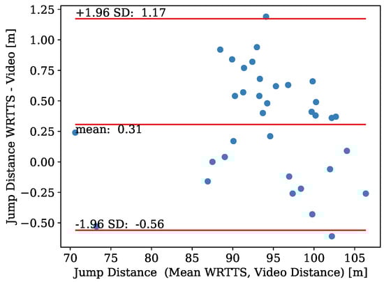 Bland–Altman plot for the comparison jumping distance determined with the WRRTS and the official video distance.