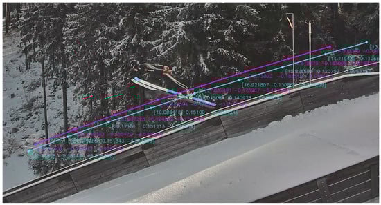 An example of the three-dimensional WRRTS position measurements projected into the image plane of a video frame can be seen in Figure 7. There, the cyan curve shows the projected trajectory of the tracker placed on the left ski of the athlete. The magenta curve is the projection of the right ski. Additionally, the coordinates for some of the measured samples are shown in the figure.