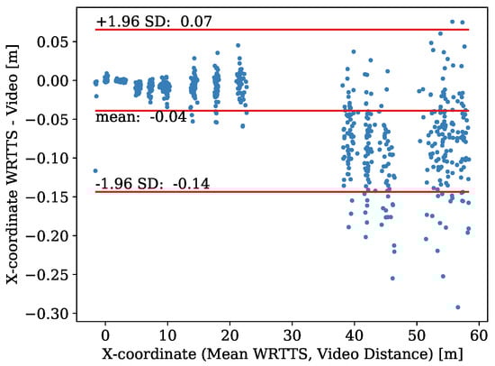 Firstly, we have a closer look at the X-coordinate of the in-flight three-dimensional position. In Figure 8, the Bland–Altman plot visualizes the results. The data range from to and consist of 741 paired measurements. The bias of the WRRTS is with an SEM of . The precision of the difference is . The resulting upper and lower limit of agreement are at , , respectively. The MAE condenses this to .