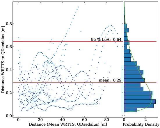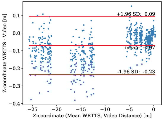 The Bland–Altman plot that corresponds to the Z-coordinate is shown in Figure 9. The data range from to and contain 741 paired measurements. The bias of the WRRTS is with an SEM of . The precision of the difference is , which leads to an upper and lower limit of agreement of and , respectively. The MAE of the difference stands at .