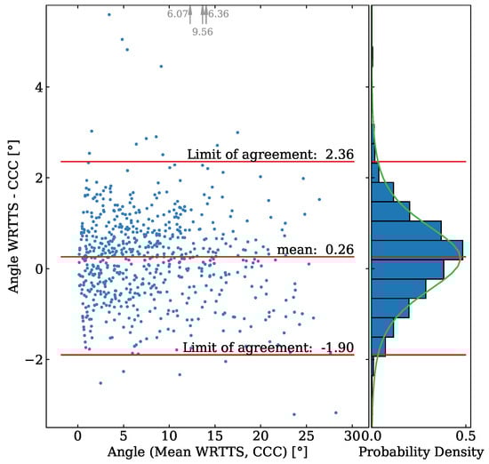 The left part shows the Bland–Altman plot for the comparison of the angle measured with the WRRTS and the angle determined in the camera images from the side along the jumping hill. The right part shows the projected histogram of the difference as well as the fitted Student’s t-distribution. The gray arrows and numbers at the top of the plot indicate three measured angles out of the plot’s range.
