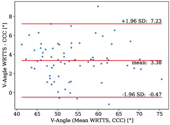 Figure 12 visualizes the Bland–Altman plot for the V-angle determination. The data for the projected V-angle range from 41° to 76° and consist of 70 measurements. For some of the jumps, due to the fog on the first day of the study, no camera measurements could be taken. The WRRTS has a bias of ° and an SEM of °. The standard deviation of the differences is °. Therefore, the limits of agreement stand at ° and °.