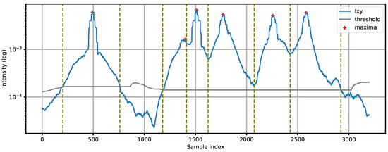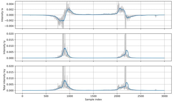 The intensity signals after the integration usually contain a high level of noise which originates from both the sensors and the inaccuracy of the intensity calculation method. Therefore, noise suppression is required before the total intensity is calculated []. We used a simple moving average filter which proved to work very well in this case, providing the necessary amount of smoothing to the intensity signal. A delay is introduced in the process of filtering, but it does not influence further signal analysis. We also experimented with a Savitzky–Golay filter, but it preserved too much variation in the intensity signals, making the analysis more problematic.