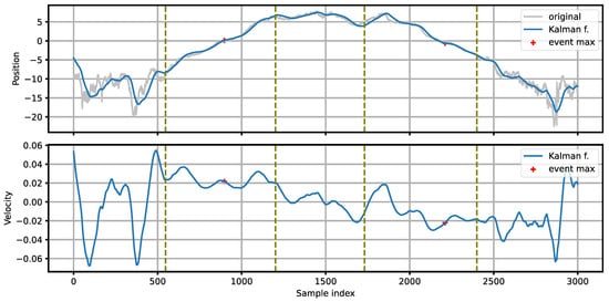 In the update stage, the estimates are calculated according to the measurement of xn (obtained from Equation (10)) and the noise covariance matrices that model the process noise (deviations from the constant velocity model) and the measurement noise (inaccuracy of the measured position). The exact Kalman filter equations are found in the literature [,] and they are not repeated here. The variance of both noise types is the most important parameter that influences the filtering result. The optimal choice of the variance values is a complex problem that lies outside the scope of this paper. In our case, the variance of the measurement noise must be significantly higher than the variance of the process noise to obtain a desired degree of the position signal smoothing.