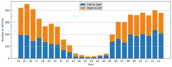 All the detections from the algorithm (sample index and vehicle direction) were recorded and then compared with the reference data. The 24-h recording was split into one-hour slots, and the performance metrics were calculated for each slot and in total. The number of vehicles in each time slot is presented in Figure 6. The overall traffic intensity was moderate, it was sparse during the nighttime (<40 vehicles per hour), but it became more intensive during the rush hours (up to 452 vehicles per hour). Therefore, the dataset represents a varying degree of traffic intensity and allows for algorithm performance evaluation in different scenarios.
