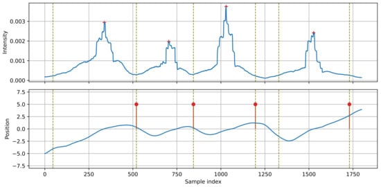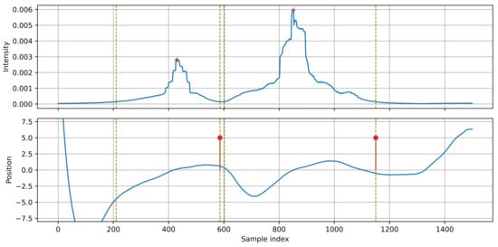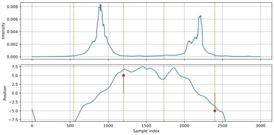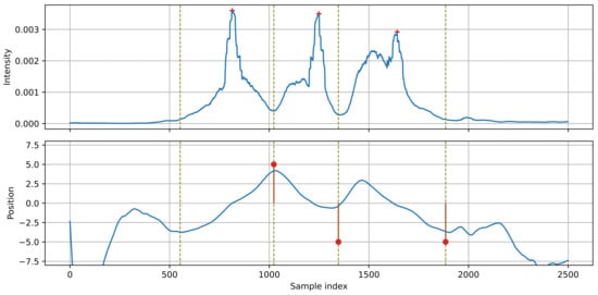 Figure 9 presents the case of vehicles passing each other: the first vehicle moves left-to-right, the second (just after the first) moves right-to-left. These two events form a single group. In this case, the position of the source increases for the first vehicle, then it decreases for the second vehicle, without a transition between them. A source transition (a segment of increasing position) is visible between the second and the third vehicle. The algorithm must be able to determine whether the change in the direction of position changes is caused by a vehicle moving in the opposite direction, or by a source transition between two vehicles moving in the same direction. In the proposed algorithm, the event detection module determines sections related to the individual vehicles. The maximum intensity point indicates the velocity value used to detect the direction of source movement.