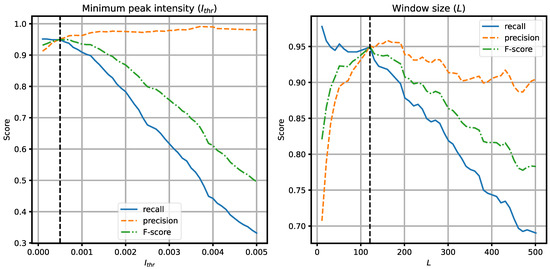 Optimization of the algorithm parameters usually involves finding the desired balance between the recall and the precision, depending on which aspect is more important for the application (less FNs or less FPs). During the experiments, we found out that two parameters have the most significant influence on the algorithm performance, namely, the minimum intensity peak Ithr in the decision module, and the event detection window length L. Figure 11 presents the plots of the performance metrics calculated for different values of these parameters. If Ithr is set too low, spurious local maxima may be detected as events, resulting in FPs. If it is too large, events with low intensity may not be detected (FNs). For the window size, if L is too small, local maxima may cause a fragmentation of the event, leading to FPs. For example, a car with a trailer may be detected as two separate vehicles. If L is too large, two or more vehicles moving close to each other may be merged into a single event, leading to FNs. In both cases, we found the values for which the recall and the precision have similar values, and the F-score reaches the maximum (these values are marked with the vertical dashed lines in the plots), and we selected these values (Ithr = 5·10−4, L = 121) as the optimum in the presented experiment. These values should be adjusted according to the signal-to-noise ratio and the distance between the sensor and the road in practical installations. Other algorithm parameters had much less significant influence on the algorithm performance in our experiment, they may be tuned if necessary.