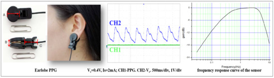 All subjects were asked to sit on a chair and maintain a stable state, and their heart rate pulse was measured using a PPG device (Model: EP520, LAXTHA Inc., Daejeon, Korea) attached to the left earlobe. The measurement duration was 5 min. The PPG sensor system used visible light with a wavelength of 640 nm and had a relative sensitivity of 60%. The sensor included two parts: a red LED as a transmitter and a photodiode as a receiver. The photodiode outputs current according to the intensity of the received light. The sensor circuit unit converts current into voltage, amplifies and filters the signal, and provides a final output signal. The frequency response of the receiver (photodiode) is 0.3–5 Hz in the −3 dB band in the characteristic curve (gain with frequency). This frequency response of the filter removes unwanted noise. The time delay of the output signal with respect to the input signal is 70.0 ms (Figure 1).