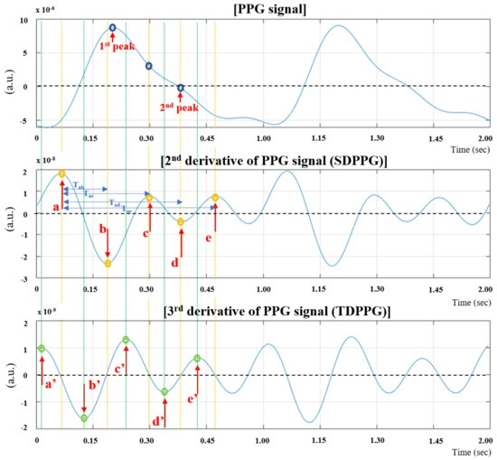 The PPG data were measured at a sampling frequency of 250 Hz for 5 min. Detrending was performed preferentially in the initial preprocessing stage to remove trends and drifts. A fourth-order band-pass zero-phase Butterworth filter considering phase delay and distortion with a cut-off frequency of 0.4–9 Hz was used to remove low- and high-frequency noise from the DC components, such as movement noise and respiratory rhythm [13]. Morphologically, the point at which the notch was minimized after passing the dicrotic notch in the volume pulse trace was set as the end of the pulse. Just after is the start of the pulse, and defined as the pulse-to-pulse interval [14]. The representative pulse value was calculated as the average of each time point based on the start of the pulse, to obtain a representative single-pulse value from the values of the pulse-to-pulse interval. The second and third derivative pulses were used to obtain the SDPPG and TDPPG from each subject’s single-pulse PPG signal. Figure 2 shows the SDPPG and TDPPG signals in the form of the second and third derivatives in the continuous pulse data. The SDPPG comprises an a-wave (increase to systolic), b-wave (early systolic peak), c-wave (late systolic and dicrotic notch), d-wave (diastolic), and e-wave (decrease after pulse) [15]. MATLAB R2019a (MathWorks Inc., Natick, MA, USA) was used for signal processing and analysis of all experimental data.