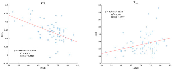 Owing to the correlation between age and other variables, the c/a, Tac, AI, and sum of the TDPPG variables were significantly correlated with age (Table 2). Figure 4 demonstrates the first-order linear fitting of the four correlated variables with age, c/a, Tac, AI, and the sum of TDPPG.