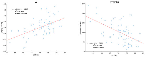 The age prediction model included only two variables. The AI and sum of TDPTG were selected based on the multiple linear regression analysis using the stepwise method, with four independent variables correlated with the dependent variable “age”. The adjusted-r2 value was 0.46 (p = 0.00). Table 3 presents the overall results of the model. The model developed using the predicted value is expressed using Equation (1): Figure 5 demonstrates the first-order linear fitting of the test set.