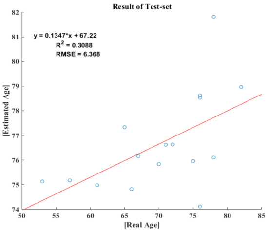 A regression model was developed to predict real age using three variables with a high correlation. The c/a variable was removed based on the stepwise method, and only AI and the sum of the TDPPG were selected. The correlation coefficient r of the developed model was 0.68, and the adjusted- r2 value indicated a model accuracy of 0.46. The results obtained using the randomly extracted test set showed that r was slightly lowered to 0.556 (r2 = 0.309), as shown in Figure 3. This means that AI and the sum of the TDPPG variables are improved when used independently.