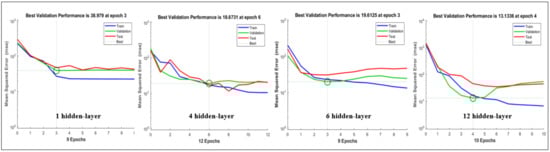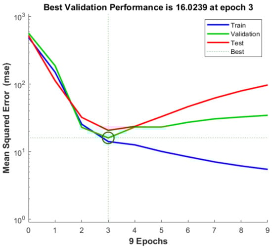 As a result of FFNN training, The MSE rapidly decreased as the network was trained; the performance is shown in Figure 6 for the training, validation, and test sets. The selected network performed the best on the validation set. The optimal performance of the training model, MSE, was 16.023, obtained for three of nine total epochs. The MSE was the lowest at epochs 3, but after that, MSE increased in validation set and test set.