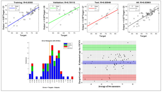 Figure 7 presents the regression results for the training, validation, test, and all datasets. For the regression model derived using FFNN, the r values were 0.855, 0.701, 0.859 and 0.839 for the training data, validation data, test data, and all data, respectively. The error histogram shows the error for the estimated result. Additionally, Bland-Altman plots were used to compare the output values of the actual age and the learning model.
