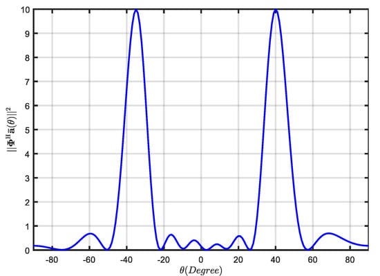 where denotes the eigenvalues of arranged in descending order. The minimum eigenvalue can be approximately considered as the estimation of the noise power []. is an eigenvector associated with . and , respectively, denote the signal subspace eigenvectors and the noise subspace eigenvectors. and are diagonal matrices. According to the properties of the eigen subspace, we have: