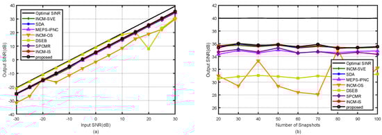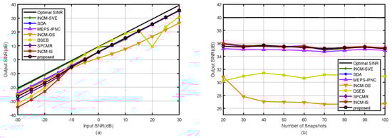 In this section, a half-wavelength spacing ULA with was considered. We assumed that there existed an SOI impinging from the direction of and two interferences impinging from and . The additive noise was presumed to be a complex circularly symmetric Gaussian zero-mean unit-variance spatially and temporally white process. All these sources were narrowband and assumed to be independent to the noise. To obtain each output SINR point, 200 Monte Carlo trials were used in each simulation. The proposed method was compared with the RAB method based on INCM reconstruction and steering vector estimation (INCM-SVE) in [], subspace-decomposition and SV adjustment (SDA) in [], MEPS-IPNC in [], INCM reconstruction via orthogonality of subspace (INCM-OS) in [], desired signal eigenvalue replacement (DSEB) in [], SPCMR in [] and INCM reconstruction via the intersection of subspaces (INCM-IS) in []. For all methods involved in the comparisons, the angular region was presumed to be . and the interference angular region to be . The number of non-dominant eigenvectors of the matrix was set as , and the RCB boundary was in []. The dominant eigenvectors of matrix were employed for in []. as in []. The constant satisfying and were as in []. Sampling points and were as in []. The scale factor and the sampling points were as in []. For the proposed method, the amplitude and phase mismatch boundary were set as and , respectively, the depth of the iteration was set as , and the saturation value was . Furthermore, the MATLAB CVX toolbox was used to solve the QCQP optimization problem in []. In our simulations, the optimal output SINR can be calculated by: