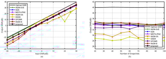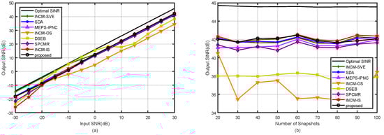 where P{·} denotes the principal eigenvector of a matrix. Figure 5a shows the output SINRs of the tested methods versus the input SNRs with the fixed snapshots . It was observed that the performance of our proposed method was similar to that in [,] at high SNRs and only lower than in [] at low SNRs. However, the method in [] had severe performance degradation at high SNRs. Figure 5b depicts the output SINRs of the tested methods against the snapshot number at and . It was observed that the proposed method had a similar performance with the tested methods in [,,], and the number of snapshots did not affect the performance of our proposed method.