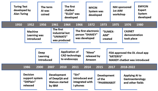 AI is not a new field; it has developed over the years, facings times of high boom and no advancements, also called the AI winters. The first time artificial intelligence was introduced was when Alan Turing developed the Turing Test in 1950. It was originally called the Imitation Game. It was a means of testing a machine’s capability to showcase intelligent behaviour greater than or at par with that of a human being’s. In 1952, machine learning was introduced, and finally, the term Artificial Intelligence was coined in 1956 [7]. From then on, the potential of Artificial Intelligence in healthcare was also recognised. In 1964, the first chatbot ELIZA was developed. This chatbot was an extended test case for the Turing Test, and it was aimed at fooling its users into thinking that they were having a conversation with a real human being. In 1972, MYCIN, a backward chaining expert, was developed by applying artificial intelligence concepts to diagnosing patients based on their symptoms and medical test results. It could identify the bacteria causing infections like meningitis and was even able to recommend medication (antibiotics) in the correct doses calculated as per the patient’s body [8]. In 1973, the SUMEX-AIM network was created. It was a nationally-shared computing resource whose sole aim was to design artificial intelligence applications for the biomedical sciences, and in 1975, the first AIM Workshop was sponsored by NIH. CASNET/Glaucoma was a casual-associational network model used to describe the disease processes, particularly in the case of glaucoma [9]. A clinical decision support system (CDSS) named “DXplain” was introduced in 1986. It assisted the clinicians by using the inputs of patent data provided to generate stratified diagnoses, and evidential support and probable follow-ups aid the clinicians with arriving at the definitive diagnosis. Furthermore, it also acts as a resource database for doctors. With the introduction of deep learning in 2000, IBM soon developed its DeepQA and Watson systems for evidence-based reasoning and deep content analysis in the year 2007. The Watson system was developed as part of the DeepQA project to act as a question-answering computer that could interact with the users and respond to questions posed in the Natural Language [10]. What followed next was a decade of the sudden boom in the applications of AI and AI-based assistants to make them available to the general public on a day-to-day basis like Alexa and Siri. In 2015, PHARMABOT, the pediatric Generic Medicine Consultant Chatbot, was introduced, which suggested generic medicines for children, and in 2017, the MANDY chatbot was introduced [11]. Cloud technologies were leveraged along with deep learning, and since then, the focus has been on applying AI to all possible healthcare fields in any way possible to aid the doctors.